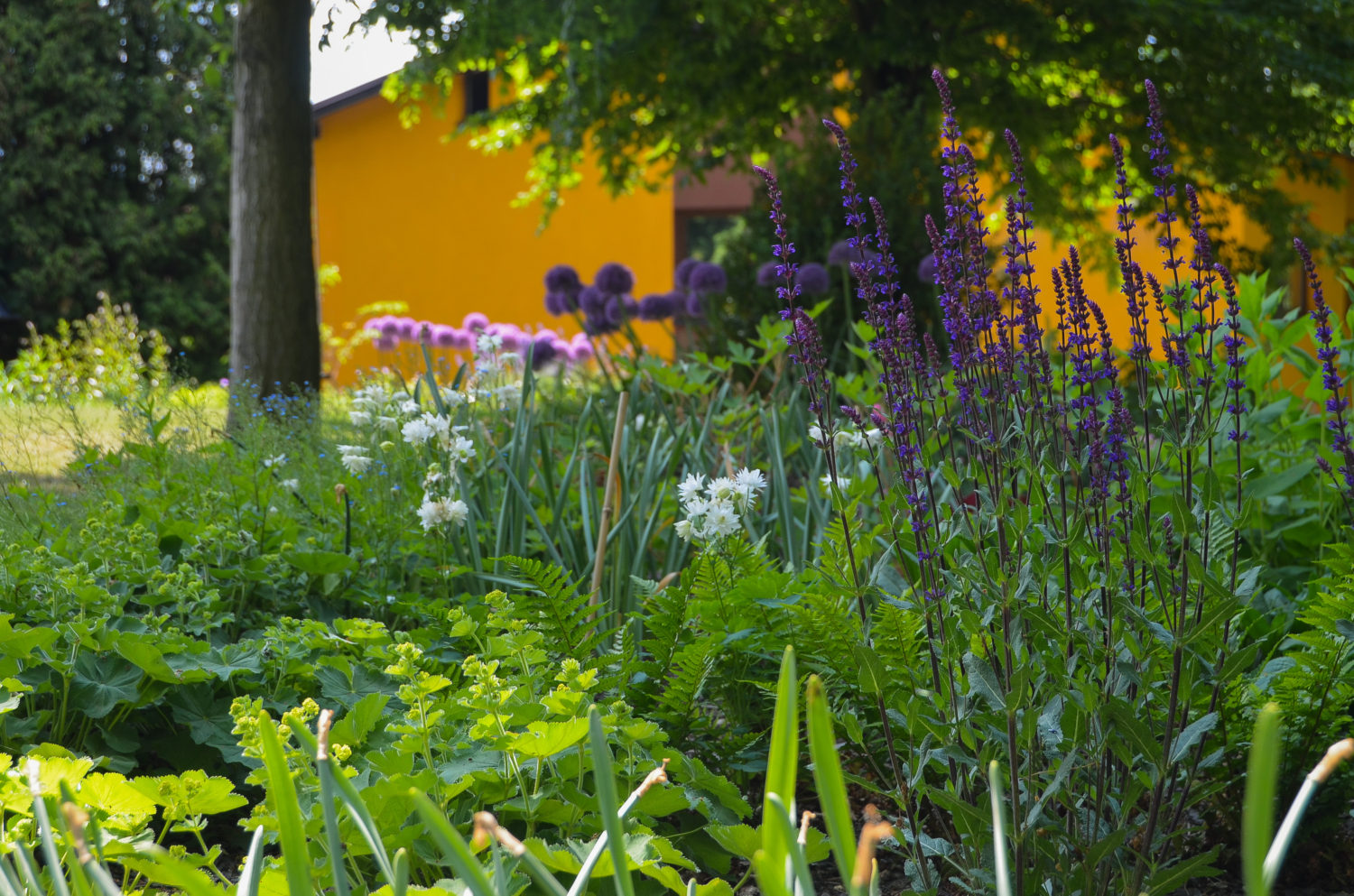 Soukormá zahrada na krásné lokalitě vysoko nad městem Mnichovice sousedí z jedné strany se zalesněným svahem, který jí dodává útulnost a jistou přírodní krásu. Přáním majitelů bylo zahradu naladit do podobné noty, zachovat přirozený ráz a doplnit prostor o kvetoucí trvalky. O prostoru a rozvržení zahrady již měli jasno a já jsem radila převážně s charakterem výsadeb. Severní, stinnější části zahrady dominují dva středně velké habry, pod kterými vznikla hajní partie s podrostovými trvalkami jako jsou pomněkovce (Brunnera), orlíčky (Aquilegia), kontryhel (Alchemila mollis), různé druhy kapradin doplněné jarními cibulovinami (sněženky, okrasné česneky…).